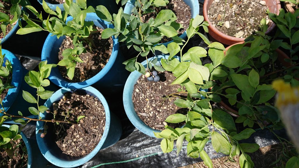 7月上旬 近所の方から ブルーベリーの苗をいただき、鉢に植えました。酸性の土壌を好むので、ピートモスや鹿沼土を入れました。また、水を好むのでたっぷりあげています。
